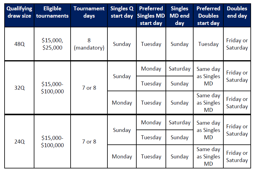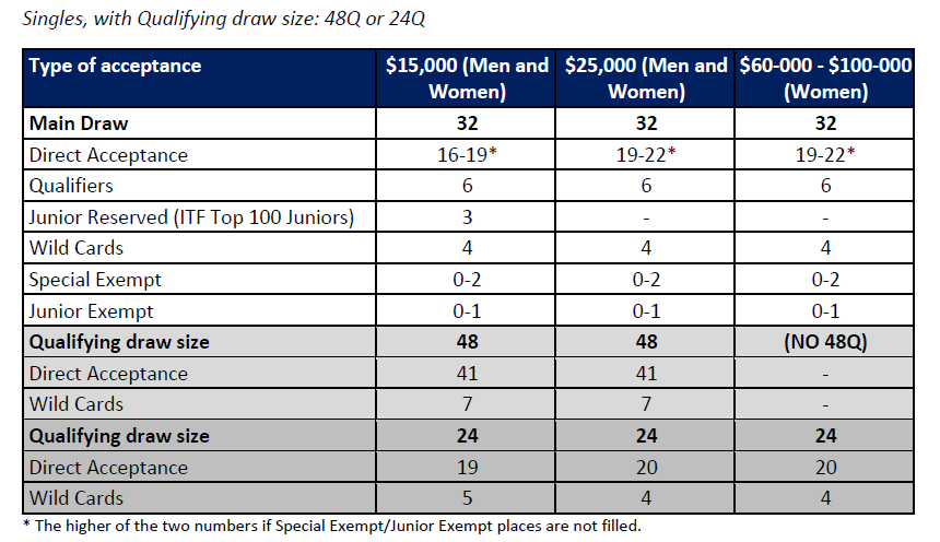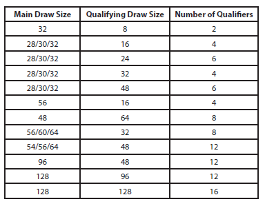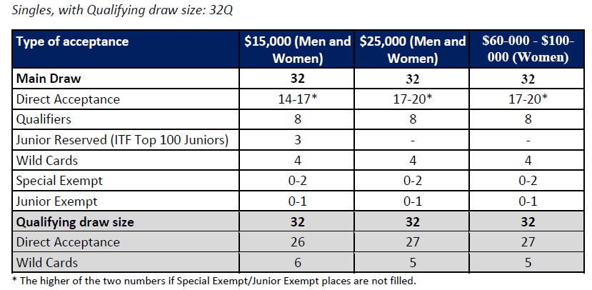 A large majority of tournaments will have a qualifying draw size of 32 places or 48 places. Exceptions that meet the criteria below may be permitted at the discretion of the ITF.