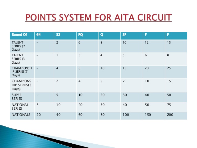 -Men’s / Women’s best six AITA tournaments played plus the points earned in ATP/WTA multiplied