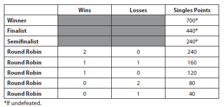 The singles and doubles competitions both are a draw of eight (8) players and teams, respectively, in a round robin format with two (2) groups of four (4) players and teams. The winner and runner-up from each group qualify for a single-elimination-format semifinal and final.
